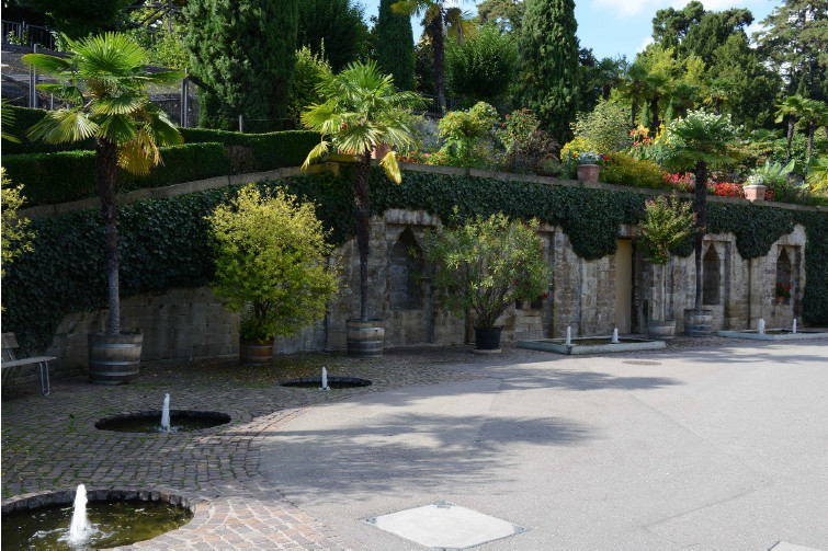 Der obere Abschluss der Terrassen bildet das Belvedere als Aussichtspunkt über die Wilhelma, unten schließt das Maurische Landhaus den Terrassenbereich ab.