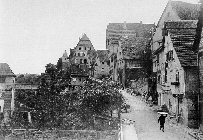 Die Bebauung auf der nördlichen Westseite zeigt giebelständige Häuser (Anfang der 20. Jahrhunderts), im höher gelegenen Bereich ab dem Tor reicht die Bebauung bis in die frühe Neuzeit zurück. Die Straße besteht spätestens seit 1220/30. Eine ältere Bebauung im Nordteil am einstigen Neckarufer wurde bei einem Hochwasser 1824 zerstört.