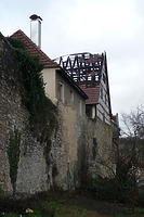 Das am 31.12.2015 abgebrannte Hintergebäude Kirchstr. 63a besaß zwei Fachwerkgeschosse, einen hohen Keller und ein zweigeschossiges Dachgeschoss. Das Obergeschoss kragte über das Erdgeschoss aus. Die Stadtmauer bildete einen Teil der nordöstlichen Rückwand.