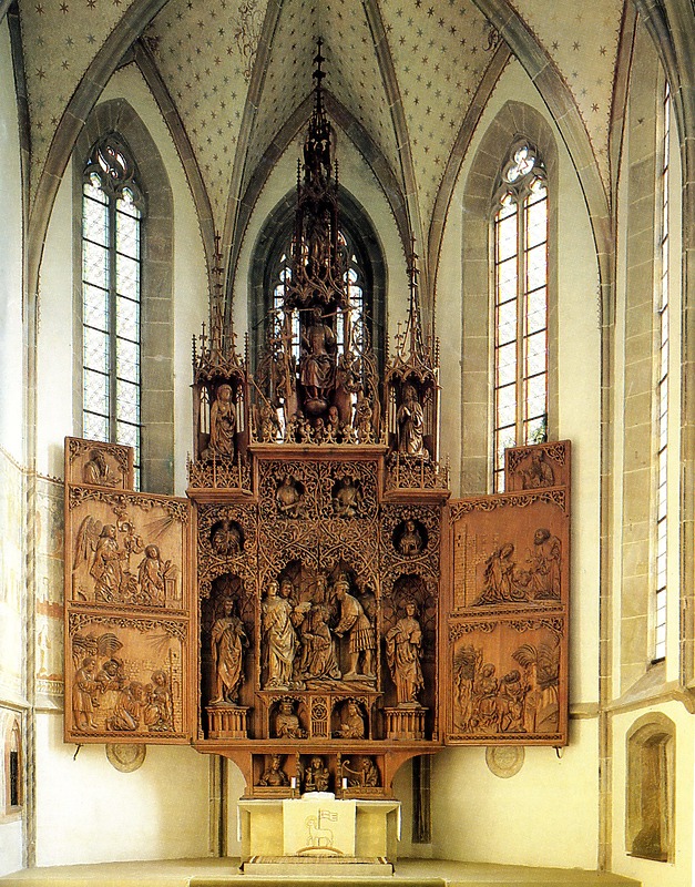 Außergewöhnlich großer, aus Holz geschnitzter Hochaltar von herausragendem Erhaltungszustand, der dem Bad Uracher Meister zugeschrieben wird und zwischen 1520-29 aufgestellt wurde. Die Höhe beträgt ca. 13 m, die Breite 4 m (bei geschlossenen Flügeltüren) und 7 m (bei geöffneten Türen).