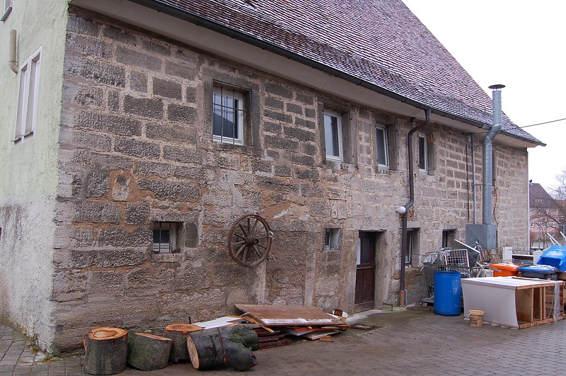 Das Mauerwerk der Westwand zeigt, die von Durchbiegekräften der Decke über dem EG fehlenden Querbindeelementen in beiden Etagen an diesem Bereich und durch die Schubkräfte des Dachwerkes, auf den sich absetzenden Bereich, eine deutliche Deformation. Die Deformation der Westwand über dem Bereich der westlichen Haustür geht bereits nahe an 20 cm Ausbauchung der hier rund 50 cm dicken Wand. Das Erdgeschoss an allen vier Hausseiten ist wohl bereits 1790 mit massivem Muschelkalkblöcken komplett erneuert worden.