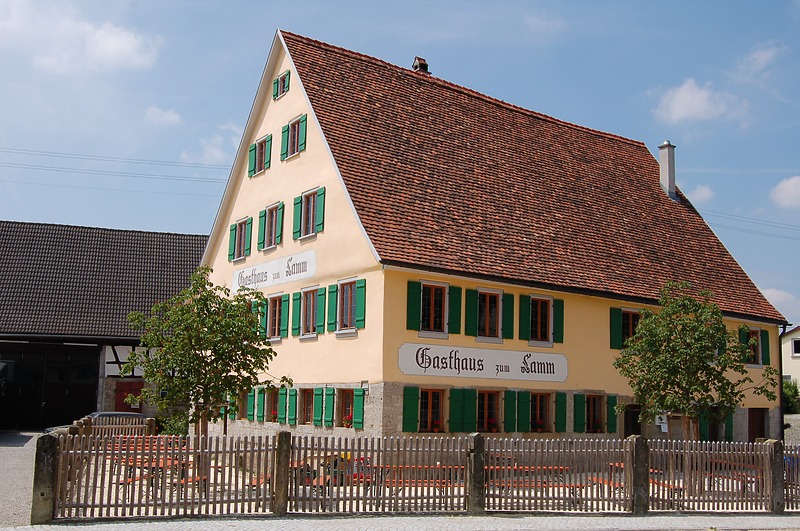 Das denkmalgeschützte Gasthaus zum Lamm ist eine rund 350 Jahre alte Dorfwirtschaft. Das historische Wirtshaus wurde im Jahr 1598 (d) errichtet und während der vergangenen vierhundert Jahre in mindestens drei wesentlichen Aktionen verändert und baulich vergrößert. Im 17. Jahrhundert werden Reparaturen an der Westfassade ausgeführt. Um 1790 wurden im Zuge einer Generalsanierung die östliche Erdgeschosswand einschließlich einer neu platzierten Südwand in Sandstein ersetzt. Außerdem wurde der Baukörper um 1,5 m nach Süden hin verlängert, ein Kriechkeller und eine Stube wurden eingebaut. Um 1850 und 1890 wurden die Grundrisse nochmals verändert und die heute noch vorhandene Innentreppe eingebaut. Um 2012 wurde das Gasthaus durch die neuen Eigentümer über mehrere Jahre hinweg restauriert.