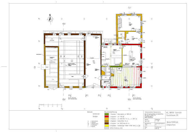 • Einzug einer neuen, längs gerichteten Balkenlage über der Küche. Ein Wechsel in der Balkenlage belegt einen zu dieser Zeit noch in der Südwestecke des Küchengefachs angeordneten Kamin.