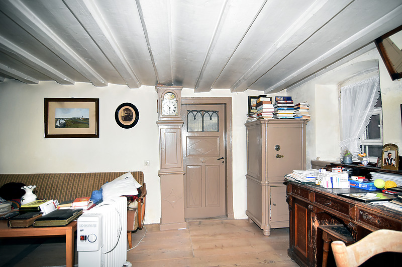 • Vergrößerung der Stube und Ausbildung einer angrenzenden kleinen Stubenkammer in der Nordostecke. In der Stube werden die neu eingebauten Deckenbalken der bauzeitlichen Bretterbalkendecke formensprachlich angepasst.