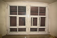 • Teilweise Aufwertung der schlichten älteren Brettertüren durch Aufdoppelung. Applikation von Rahmenteilen und abgeplatteten Füllungen mit Rautenmuster im Stil der Biedermeierzeit.