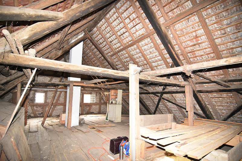 • Erneuerung des mittigen Dachquerbundes durch Einbau der hohen Stuhlstreben mit Versenkung, anstelle der vormals zweifach stehenden Stuhlkonstruktion von 1877.