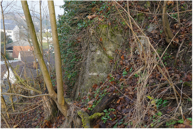 Ein Stück nach Westen abgerückt, liegt weiter oben im Hang ein längeres Stück eines geböschten Mauerzugs in gleicher Ausrichtung. Er schließt im Westen mit einer Ecke ab, die in Entsprechung zur Südostecke mit großformatigen Tuffquadern besetzt ist und im Grundriss einen Winkel von 115 Grad beschreibt, allerdings Buckel und zurückgesetzte Eckkante vermissten lässt, was aber durch Bewitterung verloren gegangen sein könnte. Die Oberkante der Mauer liegt mehrere Meter tiefer als bei der Ostseite und die Quermauer verschwindet sogleich im Hang. Die Außenschale hat sich in großem Umfang abgelöst und wird nur noch vom Bewuchs gehalten.