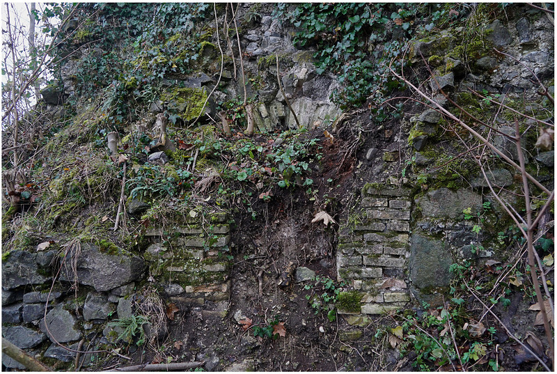 Optisch fallen drei Reparaturstellen aus der jüngeren Vergangenheit ins Auge. Mit der einen wurde ein Überhang der Abbruchkante durch ein kurzes Mauerstück in stark verschwenkter Ausrichtung unterfangen und mit den anderen beiden wurden Fehlstellen geflickt.
