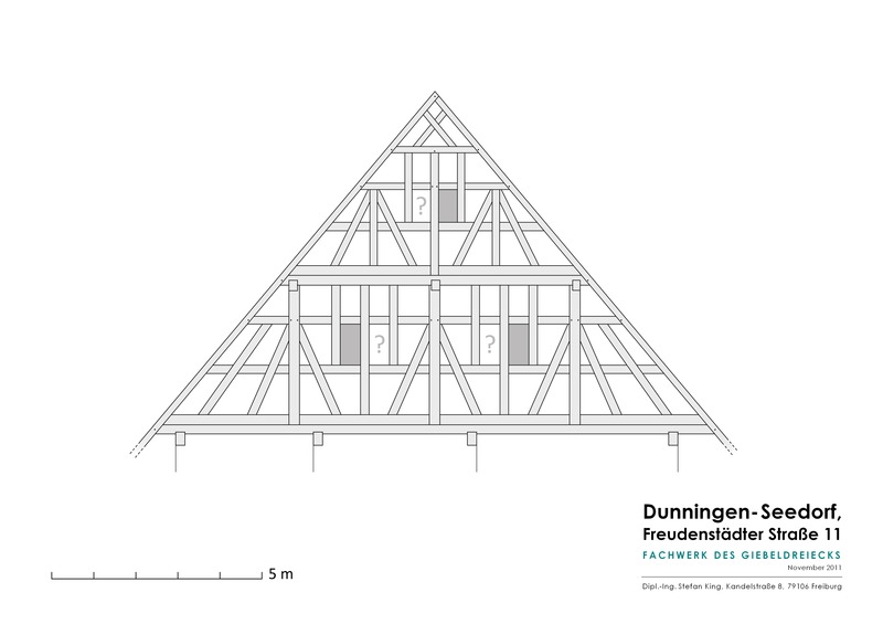 Der Nordgiebel ist mit einer zweifach verriegelten, ausgemauerten Fachwerkfüllung mit Fuß- und Feldstreben geschlossen. Das südliche Giebeldreieck ist demgegenüber nur mit einer einfachen Verriegelung und wenigen Feldstreben gefüllt und bildete die Unterkonstruktion für eine einfache Bretterschalung.