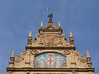 Farblich gefasster und vergoldeter Naturstein (Wappen und Schriftzüge), Sgraffito, Wandmalerei, Mosaik, Majolika, Kupferstatue.