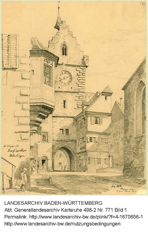 Die erste urkundliche Erwähnung der Siedlung liegt aus dem Jahr 770 vor. Es gibt jedoch Funde die bereits auf römische Besiedelung aus der Zeit nach dem Rückzug der Römer auf die Rheingrenze um 400 n.Chr. hinweisen. Nachdem Überlingen um 1210/20 das Stadtrecht erwarb, wurden um 1250 Stadtgraben und Wälle durch Mauern ersetzt. Um 1300 umschloss ein innerer Mauerring die Kernstadt, auf dessen Linie das heutige Franziskanertor (früher Barfüßertor genannt) als nördliches Stadttor lag. Östlich neben dem Franziskanertor befindet sich die Franziskanerkirche zur unbefleckten Empfängnis, das Münster liegt im Altstadtzentrum südöstlich.
