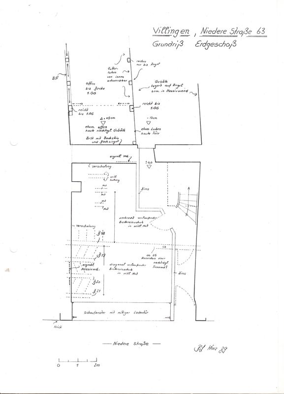 Das Gebälk war ungefast und verlief in die Haustiefe. Dort lagerte es auf einem in Nord- Süd- Richtung verlegten Unterzug. An der Straßentraufe war die Decke abgesägt und wurde durch einen Stahlträger abgefangen. Die Ausdehnung der Decke definiert wohl die ursprüngliche Stubengröße. Ihr war im rückwärtigen Grundrissbereich die Küche mit Treppenhaus zugeordnet. Ob die Trennung der Stubenkammer erst später erfolgte oder dem originalen Bestand zuzuordnen ist, war nicht zu klären. Bei dem angetroffenen Wandaufbau handelt es sich um stehende Bohlen, welche an beiden Enden durch seitliche Leisten gehalten wurden. Die Bohlen waren untereinander gefalzt und besaßen eine Stärke von mehr als 6 cm.