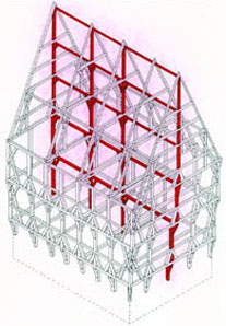 Sämtliche Wandständer der Traufwände sind in allen Geschossen durch Kopfbänder mit den Deckenbalken verstrebt. Die Deckenlagen über dem 1. und 2. OG werden in der Mittel-Längs-Achse von durchgehenden Unterzügen getragen. Diese ruhen wiederum in beiden Geschossen auf zwei (Haupt-)Stützen, die allseitig durch Kopfbänder mit den Unterzügen und den Deckenbalken verstrebt sind.