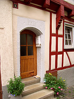 Dreigeschossiges Fachwerkhaus, Giebelseite zur Straße hin verputzt, Obergeschosse zur Traufseite vorkragend, zum zweiten Obergeschoss mit getreppten Knaggen, Satteldach, an Türbogen 1603 bezeichnet (i), 1995 Außenrenovierung (Fenster, Dachdeckung, Anstrich).