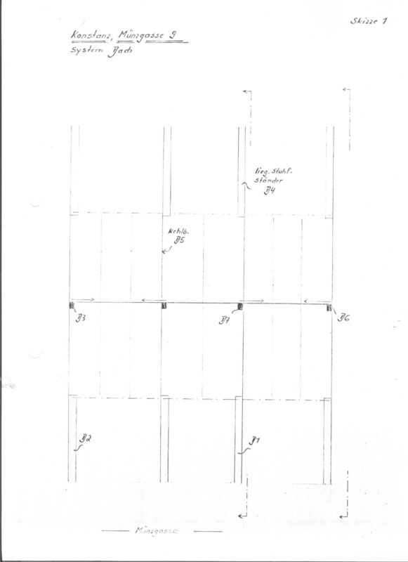 Zur Münzgasse Dach einseitig angehoben, wodurch ein 2. Obergeschoss entsteht. Vorhandener Dachstuhl weist einen liegenden verblatteten Stuhl mit auf Kehlbalken aufgesetzten Restfirstständern auf. Dachwerk besitzt Leerkehlbalken.