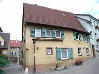 Zweigeschossiges verputztes Fachwerkhaus in Kopflage, Erdgeschoss massiv, Rundbogen-Kellertor, Satteldach, 1802 neu erbaut, An- und Umbauten 1883 und 1891.