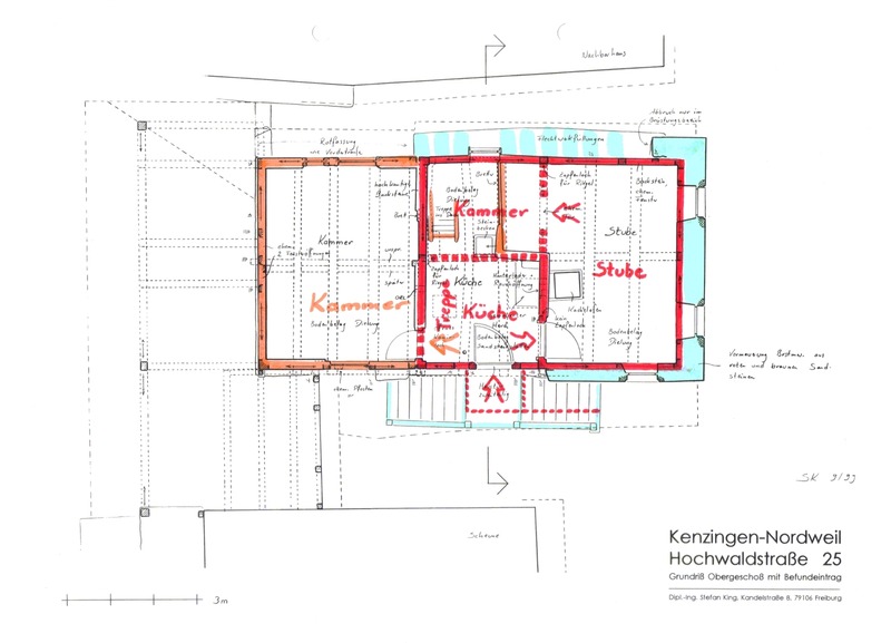 Die Erschließung erfolgte im EG durch eine breiten Zugang vom Rückgiebel her, im OG durch eine Außentreppe zur Küche.