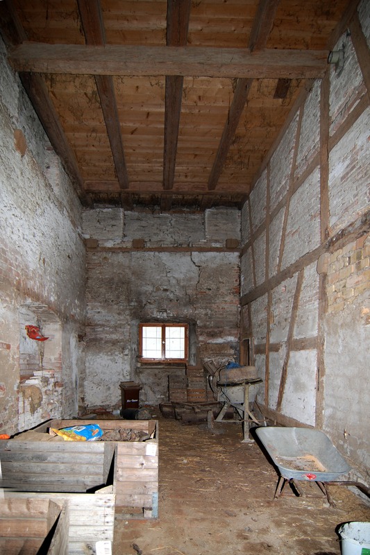 • Vermutlich erfolgte gleichzeitig auch der Einbau eines Stalles im hofseitigen Gefach der 3. Querzone sowie der Ausbau der darüber liegenden Kammer im Obergeschoss zu Wohnzwecken.