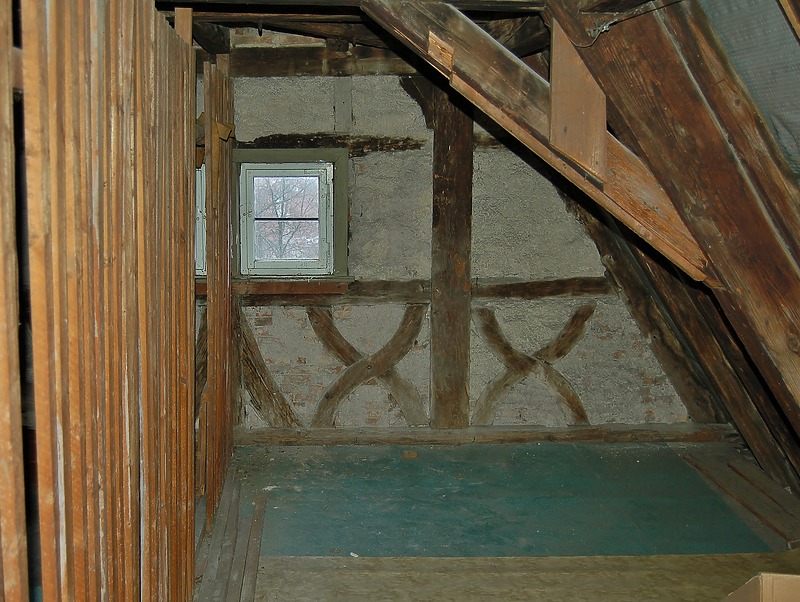 Die im 2. DG einsehbare Fassadenkonstruktion der Ostseite zeigt ein einstmals schmuckhaft gestaltetes Fachwerk zur Kirchstaffel/ Marktplatzseite hin.