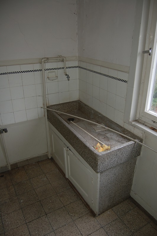 Ursache für die Feuchtigkeit: Ein unter diesem Bereich liegender Kellerraum wird mittels Lüftungszug, welcher unter dem abgebildeten Fenster endete, belüftet. Nach dem Abbruch des Lüftungszuges staut sich die aufsteigende Kellerfeuchte unter dem Holzfußboden.
