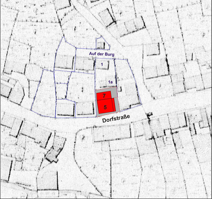 Bei dem mittelalterliche Kernbau von Dorfstraße 5 handelt es sich um ein giebelständig zur Dorfstraße hin orientiertes Gebäude, das sich, obwohl in den nach Norden verhältnismäßig stark ansteigenden Untergrund gesetzt, ursprünglich über vier Zonen erstreckte.