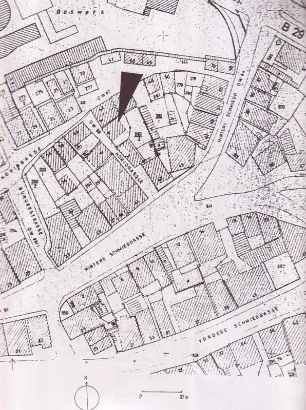 Als Wohngebiet mit klein gegliederten Hausgrundrissen beschreibt die Umgebung des Gebäudes Honiggsasse 4 eine Handwerkervorstadt.