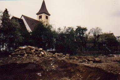 Aus der Ortsgeschichte ist bekannt, dass die Kirche anstelle einer ehem. Burg errichtet worden sein soll. Tatsächlich ist heute noch nördlich der Kirche, im Zuge der Kirchhofummauerung ein Erdwall vorhanden, der Teil einer ehemaligen Befestigung gewesen sein könnte. Auch fällt die radial ausgerichtete Parzellierung des Areals auf.