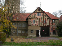 Die Scheune stößt mit ihrem Satteldach giebelständig auf gleicher Firstlinie rechtwinklig an das Wohnhaus nach Osten an. Sie ist in Fachwerk errichtet. Unter der Scheune befinden sich Reste eines Stadtmauerturms.