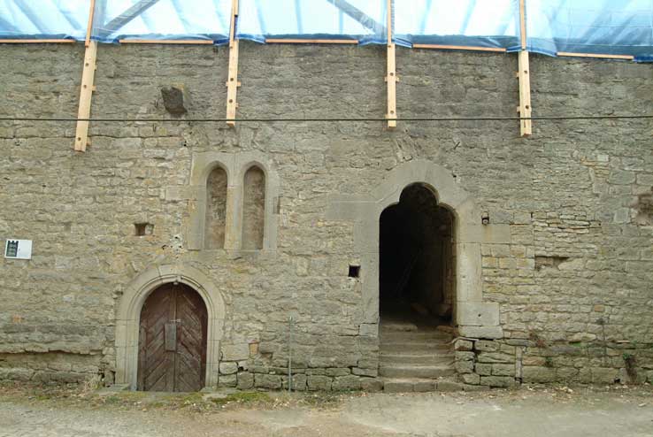 Verlängerung des Gebäudes nach Osten bis zum Burgtor (gk) . Gedoppelte Lanzettfenster vermutlich zweitverwendet, stilistisch ist es der Zeit um 1330 zuzuordnen.