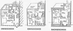 Das Gebäude ist in zwei Zonen unterteilt. Es wird seitlich von der Westseite erschlossen. Der Eingangsbereich besteht aus einem Flur, der die ganze Länge des Hauses annimmt. Mittig im Flur befindet sich die Vertikalerschließung. Das Dachgeschoss ist zu Wohnzwecken ausgebaut.