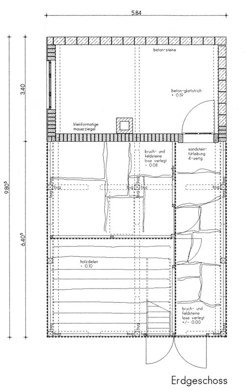 Der westliche Teil des Gebäudes ist als Mauerwerksbau ausgeführt: die westliche und die nördliche Wand sind in Betonstein-Mauerwerk erstellt, die östliche und die südliche Wand sind in kleinformatigen Mauerziegeln.