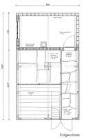 Das Erdgeschoss in seinem heutigen Erscheinen dreischiffig und somit abweichend von der konstruktiven Teilung. Den beiden östlichen Schiffen ist gegen Norden ein flurartiger Gang vorgelagert, der zum Zugang des geschlossenen Bereichs des Erdgeschosses im westlichen Schiff führt.