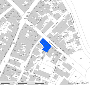 Haus Nr. 16: Die nachweisbaren Gerüstständer lassen klar einen zweischiffigen und dreizonigen Grundriss erkennen. 1. OG kragt an Straßentraufe geringfügig über. Dachfläche ist zur Straße wie auch zur Rücktraufe angehoben.