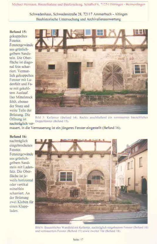 Das 1567/68 (d) erbaute Schwedenhaus erhielt seinen Namen von einem Miteigentümer Jacob Haar, genannt „der Schwede“, der 1681 eine Hälfte des Hauses kaufte. Das Schwedenhaus wurde nach den vorliegenden Indizien wahrscheinlich als Rathaus des damals freien Reichsdorfs Altingen erbaut. Es wurde wesentlich größer angelegt als andere Dorfrathäuser des 16. Jahrhunderts. Die Größe entspricht etwa städtischen Rathäusern der Zeit, allerdings ohne die dort übliche Markthalle im Erdgeschoss und mit kleinerer Ratsstube. Die fehlende Markthalle erklärt sich aus den unterschiedlichen Wirtschaftsstrukturen des Dorfes, es gab weniger Bedarf für eine Markthalle. Vielmehr vereinigt das Gebäude Ratsräume mit sonstigen Stuben und Kammern sowie Magazinräumen im EG. Das Dach wurde weniger intensiv genutzt, was sich an den noch vielfach erhaltenen Bodenbrettern im DG ablesen lässt. Auch fehlt eine direkte Beschickungsmöglichkeit des Dachraums durch Ladeluken oder Gaupen. Nicht auszuschließen ist, dass das zweite Obergeschoss vielleicht schon von Anfang an zu Wohnzwecken diente, vielleicht als Amtswohnung des Schultheißen oder eines Schutzvogtes. Der später mehrfach nachgewiesene Besitz des Gebäudes durch Schultheißen könnte als Indiz dafür interpretiert werden. Gesichert ist dies jedoch nicht.