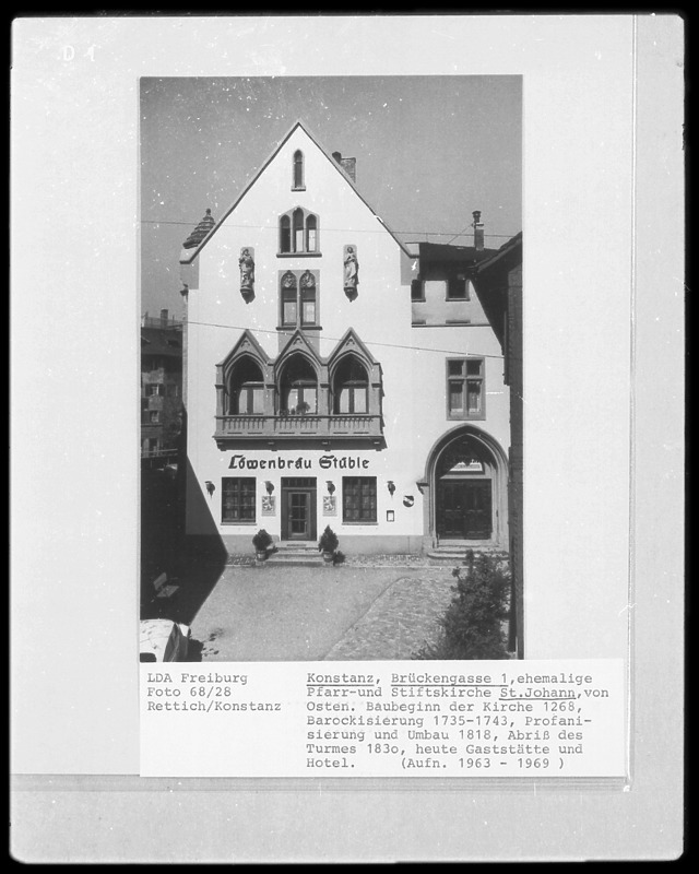 Am Platz der heutigen Liegenschaft soll bereits im 10. Jh. der Hl. Konrad eine Taufkirche errichtet haben, die auch als Pfarrkirche für Laien genutzt wurde. Rings herum dehnte sich ein Friedhof. Von 1266-1276 wurde die Pfarrkirche St. Johann zu einem Chorstift erhoben. Anstelle des Kirchleins aus dem 10. Jh. entstand ein Neubau, dessen Chorfundament am 21. Mai 1268 gelegt wurde. Anfang des 15. Jahrhunderts wurde an den gotischen Langchor eine dreischiffige, wohl flach gedeckte Pfeilerbasilika gesetzt. 1432 entstand die Marienkapelle am südlichen Chor und der im Jahr 1434 errichtete Kirchturm. Zwischen 1735 und 1743 fand eine umfassende Renovierung der Kirche statt. Im Jahr 1816 wurde die Kirche entweiht und diente ab 1818 als Brauerei. Der Kirchturm wurde 1830 abgerissen. 1889 folgte die Umnutzung und Umgestaltung zum katholischen Gemeindehaus, Hotel und einer Gaststätte..