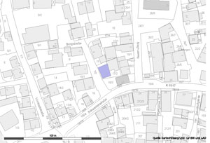 Liegt im westlichen Teil des Ortes neben dem Rathaus. Das Gebäude seht giebelständig zur Hauptstraße (Schwedenstraße) orientiert und traufseitig an der Burgstraße.