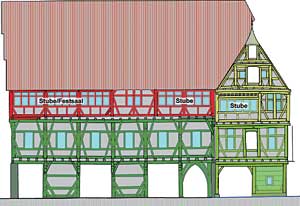 Der hallenartige Charakter mit dem Tragwerk sowie Reste des schmuckvollen Fachwerk am Giebel sind noch erhalten. In den Dachgeschossen sind die Raumstrukturen teilweise mit Farbfassungen noch erhalten.
