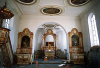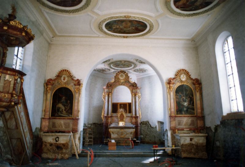 - Vorbericht für die Restaurierung (Außen: Putz, Stein; Innen: Deckenmalerei; Emporenbrüstung, Altar, Kanzel)