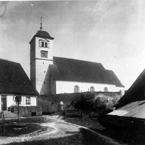 Zweite Hälfte des 12. Jahrhundert Turm-Unterbau (gk, d). Dachabdruck eines Vorgänger-Lirchendaches erhalten.